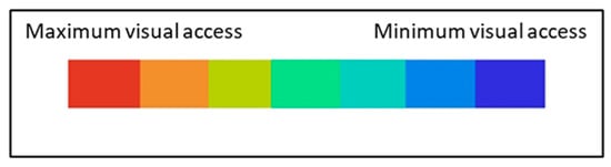 Connectivity, shown on axial maps, was utilized to represent building networks more simply. On an axial map, the last set of lines that passes through each convex space forms all axial links. These lines, which can be viewed as paths (or possibly as routes), are called axial lines. Moreover, an axial line is the longest line representing the highest possible axial extension of any point in a straight line []. Hillier [] and Turner [] defined an all-line axial map as “a set of lines made up of all lines drawn tangent to vertices that can see each other”. In this study, the zoning plan included the locations of the human factor components, namely, the reception and nurse stations, as the focal points. Axial maps were used to represent the spatial design in lines, and a VGA was used to examine isovists, with the scale of colors shown in Figure 7 []. Furthermore, the DepthmapX tool provides a numerical value for each space’s visibility and connectivity [].