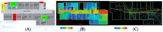 The spatial data of the ER in case study “A” are presented in Figure 11. There are a total of three human factors in this case: a reception, an FLNS, and an ONS. The layout includes three pathways, which are indicated as having high visibility, marked in yellow and green. Furthermore, the interaction between two of the pathways presents the highest number of points in the layout, marked in orange and red. The first nurse station (FLNS), which is near the ambulance entrance (A. Entrance), is marked in a combination of orange, yellow, and green, whereas the second nurse station (ONS), which is in the observation room, is marked in yellow, indicating its high visibility. However, the reception, as the second human factor, comes in at a lower level than the nurse stations, as it is marked with green and blue tones. The areas with the lowest levels are the treatment and service rooms, which are private zones, marked with blue and dark blue tones.