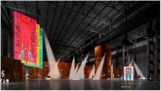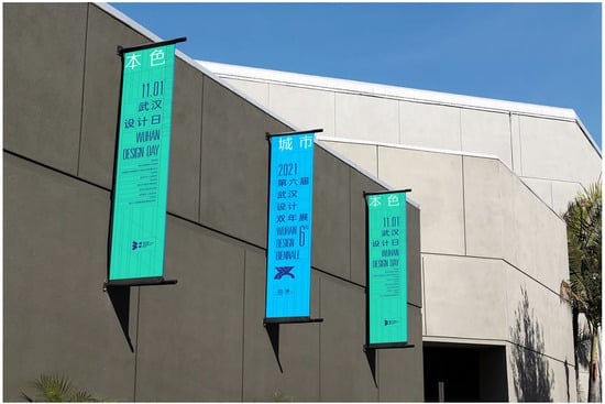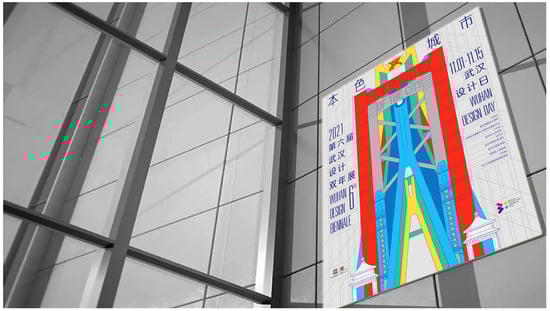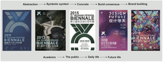 During the early stages of project design, we conducted extensive research on design cases related to city image and art design exhibitions. We also conducted a comprehensive analysis of the relevant designs from the previous five Wuhan Design Biennales, and formulated the overall design ideas for 2021 year’s project. This is mainly reflected in two points, as follows. (1) In the context of urban competition, important events such as exhibitions should be effectively linked with the city’s brand image so as to achieve mutual reinforcement in communication. As the Biennale is the first exhibition after the COVID-19 pandemic, its design must take on the important task of shaping and disseminating the image of Wuhan as a “hero city” in the new era. (2) Through relevant research on the design of the previous five exhibitions, it can be seen that the overall image of the first three exhibitions highlighted academic brands and was relatively serious. As can be seen from the summary in Figure 2, when the Wuhan Design Biennale was established in 2011, it was positioned as a relatively serious academic activity. The second (2013) and third (2015) iterations also maintained this tone, and the recognition of brand logo symbols was continuously strengthened in image design. In 2017, Wuhan officially became a Design City of UNESCO [36]. As a brand event of the Design City, the Design Biennale emphasizes the integration of design into life and the integration of design culture into urban culture. The style of exhibition design is no longer deliberately serious, but gradually tends to be lively and fashionable, actively narrowing the distance between it and the public. It should not only make the audience understand and accept it but also allow them to participate in it and interact to achieve the common construction of the city’s brand image.
