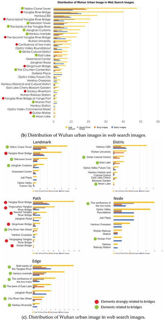 The survey of internet image imagery, which involved a comparison and comprehensive analysis of search results from multiple search engines, yielded results that were somewhat similar to those from population surveys. However, the image content was more densely concentrated, and the key elements of the “River City Image” were more prominent. The river, which runs through Wuhan city, reflects its multilevel culture and history, highlighting the image of the bridge. After analyzing and classifying all image elements, we found that bridge elements made up almost half, with the majority strongly correlated and distributed across the five elements of the image. Simultaneously, media images highlighted bridges with stronger images (Figure 4).