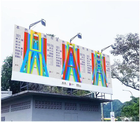 Visual poster hanging on the top of a building. The non-English characters in the picture represent the theme and logo on the poster of the 2021 Wuhan Biennale. (image source: authors).