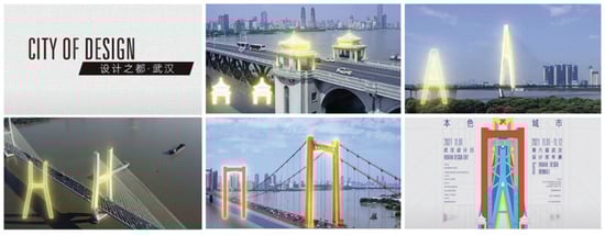 Second, the interpretation of dynamic visuals takes place in the visual and graphic space of movement. Motion graphics serve as the presentation format for the main visual poster. The main visual poster features graphic images of 13 bridges, presenting a process of image transformation through dynamic interpretation (Figure 11). This process extracts and reproduces the experience of people walking through the city of Wuhan. As discussed above, bridges are the first of all roads in the perception of urban images. Bridges occupy an important position in the daily traffic of Wuhan residents. Walking through the city of Wuhan also means shuttling between different bridges. The expression of dynamic graphics connects the symbols of many bridges and connects the perception and memory of the city of Wuhan.