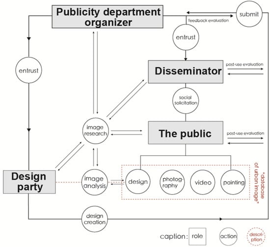 For the theme concept of “urban image design” [18,19,20], we can analyze the concepts and research perspectives of several dimensions, such as “urban image”, “urban brand”, and “image design”, which together constitute the content of relevant research. The broad “urban image” concept takes the perspective of the comprehensive urban environment. Starting from environmental cognition, it is proposed that the formation of urban imagery is a process jointly led by people and the environment and is the public’s psychological image reflection of the city. The perspective of “urban brand” takes the modern corporate brand image theory (CIS) as the basic theoretical framework for urban brand image research [21]. The perspective of “image design” is a relatively narrow and specific visual image design, such as urban visual imagery, event activity imagery, related product imagery, etc. Figure 1 reflects the connotation of “urban image design” for the specific practice that this study focuses on, including basic content with “urban visual image design” as the core, and “urban events” and “characteristic brands representing the city image” as important components. Furthermore, as media technology advances, the relationship between media space and image has emerged as a new area of study. New media have changed the presentation mode and technical methods of design and constructed a new communication field between reality and virtuality, which has also affected the formation of design concepts and ideas. The main purpose of this article is to explore the construction of a practice-oriented design methodology, so the focus of the research is on the specific “image design”, but also taking into account the research framework of the macro-urban image.