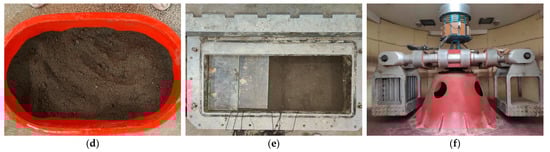 Test procedures of (a) labeling model box size; (b) embedding sensors; (c) pre-burying simulated piles; (d) preparing embankment soil; (e) filling embankment and simulating traffic load; and (f) placing model box into centrifuge.