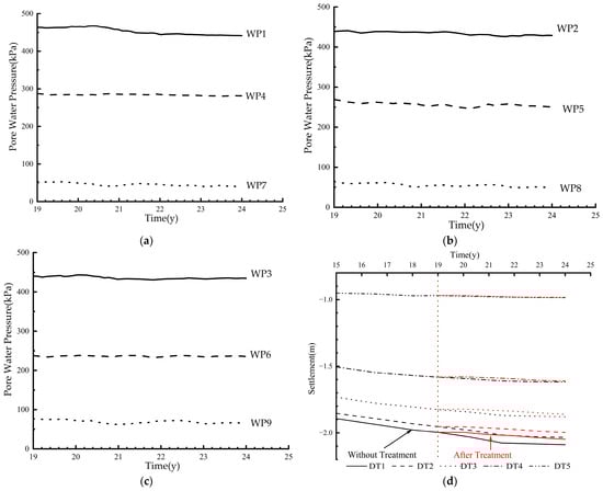 Figure 6 shows the developing trend of pore water pressure and settlement at each measuring point in the next 5 years after being treated by the JGP method. The pore water pressures of each measuring point are in declining states. Because the jet grouting pile directly reinforces the soft soil foundation compared with the control test, it increases the modulus and synergistic deformation ability of the foundation soil. It can be seen from the three measuring points of WP1, WP4, and WP7 at the middle line of the embankment that their pore water pressure curves are close to horizontal in the final 2 years of the simulated operation. Compared with the control test and the LRP method, the JGP method has shown its enhancing ability in the synergistic deformation of the soft soil under the embankment. It can be verified from the WP1, WP2, WP5, WP7, WP8, and WP9 points within the reinforcement range, as the average falling rates of pore water pressure of these measuring points show little difference, while the pore water pressure falling rates of the LRP method and the control test are highly correlated with the soil depth. In addition, the WP6 measuring point is on the horizontal outward pore water dissipation path. On the one hand, it has pore water supplemented from the center of the embankment. On the other hand, the excess pressure caused by the overlying load is low. The pore water there dissipates slowly but is then supplied, showing the rising trend. WP2 and WP5, which are also on the dissipation path, are below the embankment slope. The loads are larger, and the pore water pressures dissipate quickly, so the pore water pressure curves are still declining.