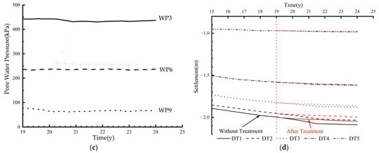 - The high value of pore water pressure corresponds to the rapid development of settlement. The settlement simulated by the control test in 24 years developed rapidly in the first 3–4 years and mainly occurred in the existing operation period of 19 years, up to 96.7%. However, at the end of the test, the pore water pressure continued to decrease, and the settlement curve did not converge. If not treated, a large subsequent settlement would occur. And there is a large settlement difference in its natural state, which also needs to be considered.