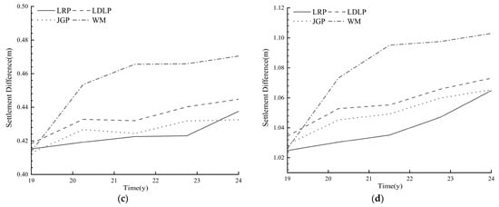 - The three treatment methods can significantly decrease the development of settlement. The settlements after being treated by the LRP, JGP, and LDLP methods in 5 years are reduced by 32.79%, 38.04%, and 41.45%, respectively, compared to those without treatment. In addition, the settlement curves of the JGP and LDLP methods have a convergence trend.