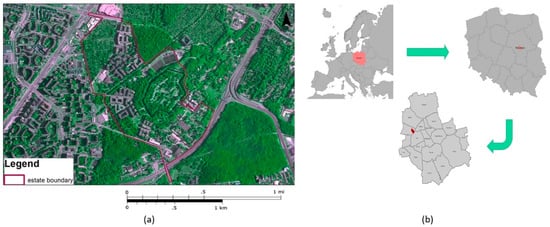 Location of the investigated Fort Bema Park and Residential Complex—(a) aerial view of the complex (b) location in relation to the province and the municipality in territorial terms; source: own elaboration.