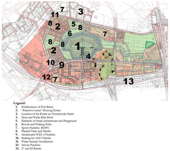 Figure 3 provides a comprehensive illustration that enhances the understanding of the revitalization of the Fort Bema Park and Residential Complex. It depicts 13 different elements that are integral to the project, highlighting how each component contributes to the overall success of the revitalization effort. Together, these elements create a synergistic effect that is critical to improving the quality of life in this part of Warsaw. By visualizing these facilities and structures, Figure 3 underscores the importance of an integrated approach to urban development where each aspect works in harmony to create a cohesive and vibrant community.