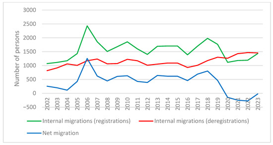 The data for Bemowo indicates significant trends in internal migrations, particularly in the context of the Fort Bema Park and Residential Complex, which occupies less than 10% of the total area of Bemowo (whose size is estimated to be around 24.95 km2 or about 2495 hectares). However, it is noteworthy that in terms of usable floor space (PUM), this percentage is considerably higher. The construction of this complex had a significant impact on the demographic data for Bemowo during the period of its development, especially from 2002 to 2009, when over 200,000 square meters of PUM were realized as part of the revitalization project. The apartments were delivered continuously year after year, contributing to a steady influx of residents. While analyzing the internal migration data from 2002 to 2009, one can observe trends that may serve as proxy indicators for assessing the attractiveness of Bemowo in terms of revitalization efforts. This is particularly relevant given that this period coincided with the completion of many new housing units in the Fort Bema complex. Although caution should be exercised when interpreting these data as proxies, they provide valuable insights into the area’s demographic changes. From 2002 to 2009, there was a notable increase in registrations for internal migrations, peaking in 2006 with 2431 registrations and a net migration of 1257. This surge can be attributed to the introduction of new residential options that attracted more residents to Bemowo. The data indicate positive net migration during these years, suggesting that the revitalization efforts were successful in making Bemowo an appealing location for new residents. However, after 2009, the internal migration figures show fluctuations and even negative net migration starting from 2020 onwards. This decline may reflect broader economic factors or changes in housing demand that could be associated with market saturation or shifts in demographic preferences.