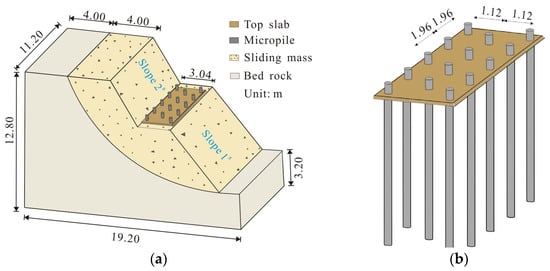 Accumulation landslide reinforced by micropiles: (a) dimensions of landslide model; (b) layout of micropiles.