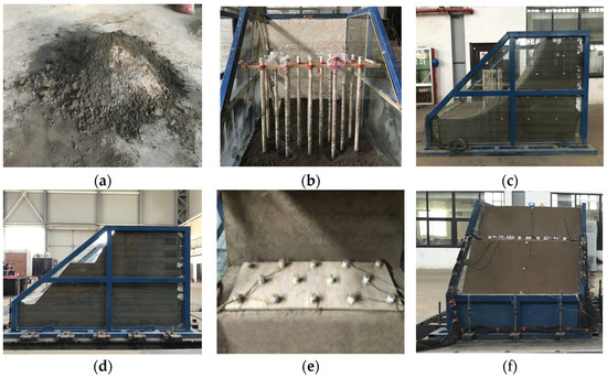 The preparation process of the landslide model: (a) mixing the simulated soil; (b) fixing the micropiles and making the sliding bed; (c) forming the sliding surface; (d) creating the sliding mass; (e) installing the top slab; and (f) securing the landslide model to the shaking table.