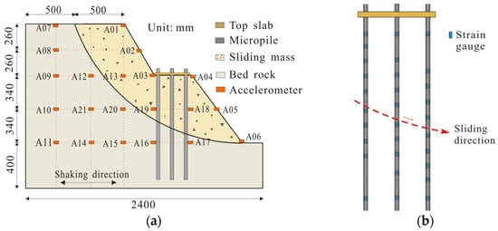 Distribution of measuring points: (a) layout of the accelerometer in the landslide model; (b) layout of strain gauge on the micropiles.
