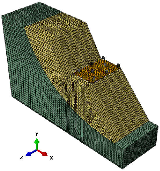 To replicate the behavior of the sliding mass soil, the Mohr–Coulomb elastic model was employed, while an elastic model was used to represent the bedrock of the sliding bed and the top plate of the micropiles. The material parameters for the numerical model were derived from measurements obtained during tests and subsequently adjusted to reflect the prototype landslide. The specific parameters are shown in Table 4. The predominant element type in the model was C3D8R hexahedral elements, supplemented by C3D6 wedge-shaped elements.