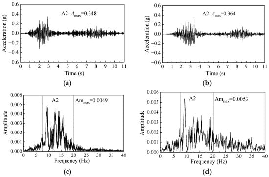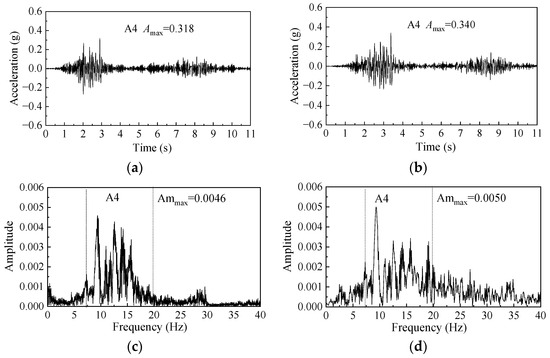 Based on the comparison between Figure 5a and Figure 5b, as well as between Figure 6a and Figure 6b, it can be seen that the acceleration time history curves obtained from numerical calculations closely match those derived from shaking table tests. The acceleration obtained by tests and numerical simulation shows the same variation trend with time, except for slight differences in values and phases. The peak acceleration Amax of measurement point A2 in the shaking table test is 0.348 g, and the numerical calculation yields a value of 0.364 g, resulting in a maximum error of 4.6%. Similarly, for A4, the experimental value is 0.318 g, and the numerical result is 0.340 g, indicating a maximum error of 6.9%.