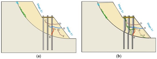 In the range of 0.1–0.6 g, no observable changes were observed in the landslide behavior. However, when subjected to a 0.8 g, 8 Hz sine wave, a tension crack, A–B (approximately 22.5 cm in length), appeared on the frontal side of the front row piles (Figure 7a). Simultaneously, soil near the apex of the slope exhibited loosening compared to its initial state, accompanied by a slight accumulation of gravel along the sliding surface. Subsequently, under a 0.8 g, 16 Hz sine wave, crack A-B continued to widen while cracks C–D and E–F developed at the shoulder region of the slope, where the sliding mass began to move (Figure 7b and Figure 8b). The crest subsided by approximately 1 cm, and the toe displaced by about 0.5 cm.