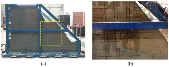 The test model box is a rigid container with internal dimensions of 2.6 m (length) × 1.4 m (width) × 1.67 m (height). It consists of an edge-angle steel base support frame, a steel plate bottom, and transparent tempered glass walls on the left and right sides, to observe the deformation and failure phenomena. To minimize interference caused by seismic wave reflections and ensure accurate observations, two 10 cm thick polystyrene foam boards were securely attached to both ends of the container [26]. Additionally, to reduce relative displacement between the soil and the bottom of the box, a layer of cobblestones was affixed to its inner surface.