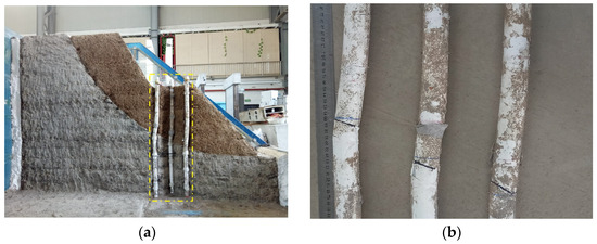 The preparation process of the landslide model (Figure 2) is illustrated as follows: (i) mixing the simulated soil; (ii) fixing the test micropiles to the predesigned position and constructing the sliding bed by sequentially compacting soil layers; (iii) forming the sliding surface according to its designated shape; (iv) creating the sliding mass; (v) installing a top slab onto the apex of each micropile; and finally, (vi) securing the landslide model to the shaking table.