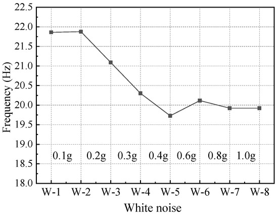 It can be seen that the natural frequency of the accumulation landslide exhibits a decreasing trend, ranging from 21.8 to 19.7 Hz. Following the low-magnitude 0.1 g wave test, the natural frequency of the landslide remained generally consistent with its initial value of 21.8 Hz. However, under the 0.2 g to 0.4 g wave tests, the natural frequency decreased linearly by approximately 3.7%. This indicates that, although no visible macroscopic damage was observed, the internal damage that occurred in the landslide contributed to a reduction in its stiffness. During the 0.6 g to 1.0 g wave tests, discernible macroscopic damage phenomena emerged in the sliding area, and the natural frequency of the landslide did not decrease further due to the support of the micropiles. Ultimately, it exhibited minor fluctuations, stabilizing at approximately 20 Hz. Compared to other supporting structures such as retaining walls and anti-slide piles [38], micropiles are less effective in enhancing the overall stiffness and natural frequency of the slope during an earthquake. This is mainly because the micropiles are lightweight flexible retaining structures, which have little influence on the natural frequency of landslides.