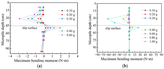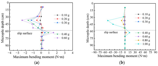 where M represents the bending moment, Es denotes the elastic modulus of the micropile, and W signifies the section modulus. ε1 corresponds to the strain on the front surface of the micropile (for clarity, this is defined as facing towards the slope toe) obtained by the shaking test, while ε2 refers to the strain on its rear surface (facing away from the slope toe) obtained by the shaking test. Figure 11, Figure 12 and Figure 13 illustrate the maximum bending moment curves of three rows of micropiles subjected to Wenchuan waves in the test.