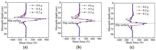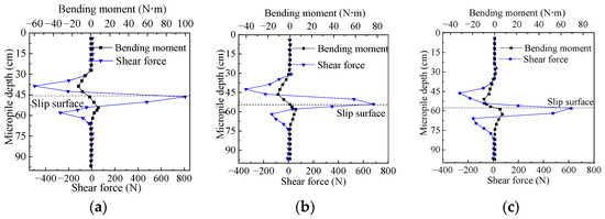 Shear force distribution curves of the micropiles: (a) the rear pile; (b) the middle pile; and (c) the front pile.