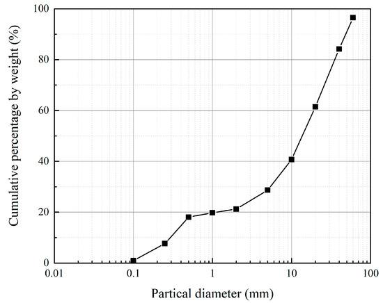 As shown in Figure 1, the sandy gravel used in this study was obtained from Hainan Tibetan Autonomous Prefecture, Qinghai Province, China. Its gradation curve measured by the sieving method is shown in Figure 2. The maximum and minimum dry density test of gravel was carried out according to the standard for geotechnical testing methods (GB/T 50123-2019) [38]. The basic physical properties of the sandy gravel obtained from the tests are shown in Table 1. To ensure that the particle shapes of all samples were as consistent as possible, the sandy gravel collected from the site was uniformly mixed before being distributed. All gravels were dried at 105 °C to ensure that the moisture content was 0. Additionally, the sheared sandy gravel was not reused, to prevent changes in grading caused by particle fragmentation that might interfere with the results. The material of the steel board is Q235B, and the concrete boards were fabricated from a mixture of water, PO 42.5 cement, river sand (finer than 2 mm), and stone (smaller than 2 cm) at a mix ratio of 1:2:4:6. Both steel boards and concrete boards have smooth surfaces.