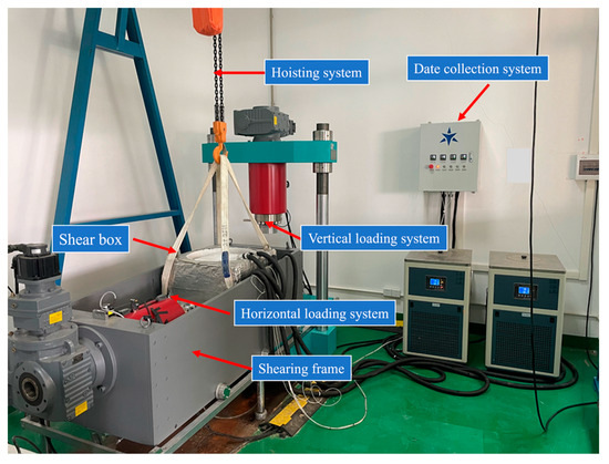 As shown in Figure 3, the large-scale direct shear equipment used in this study is made up of a hoisting system, vertical loading system, horizontal loading system, data collection system, shearing frame, and shear box. Among them, the loading rate of the loading system is 0~10 mm/min, the force range is 500 kN, and the maximum lifting mass of the hoisting system is 2 t.