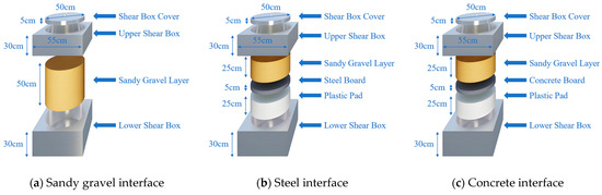The relative density of the sandy gravel stratum at the site was 0.7. Considering that construction may disturb the stratum, leading to a decrease in relative density, or compaction, leading to an increase in relative density, four relative densities of 0.3, 0.5, 0.7, and 0.9 were selected for this study. Considering the stress state at different stratigraphic depths and under different loading conditions (wind, snow, etc.), the range of normal stresses chosen in this paper is from 100 kPa to 400 kPa. The density of the specimen corresponding to each relative density can be calculated according to the maximum and minimum dry density as shown in Table 1. Then, the total mass of the specimen can be calculated from the volume of the specimen. The composition of the specimen is shown in Figure 4. As shown in Figure 4a, the specimen for the sandy gravel direct shear test consists entirely of sandy gravel, and the specimen has a diameter and height of 50 cm. As shown in Figure 4b, the specimen for the interfacial shear test at the sandy gravel–steel interface consists of a plastic pad in the lower part, a steel board in the middle, and a sandy gravel layer in the upper part. The height of the plastic pad is 20 cm, the height of the steel board is 5 cm, and the height of the sandy gravel layer is 25 cm. The specimens for the interfacial shear test at the sandy gravel–concrete interface have the same structure as the steel interface, with only the steel board replaced with a concrete board. The test process consisted of three parts: sample preparation, consolidation, and shearing. The specimen of the direct shear test of sandy gravel was prepared in five layers. The specimen mass of each layer was calculated according to the total mass of the specimen, and then the specimen of corresponding quality was weighed and poured into the shear box and compacted to a height of 10 cm. The preparation of the sandy gravel layer in the sandy gravel interface shear test was carried out in two layers, and the specific process was the same as that of the sandy gravel direct shear test. After the specimen preparation was completed, the shear box was lifted into the shear frame, and then 100 kPa, 200 kPa, 300 kPa, and 400 kPa normal pressure was applied to the top of the specimen. After the height of the specimen no longer changed, a shear rate of 6 mm/min was applied to the specimen in the horizontal direction. Shearing was stopped when the shear displacement reached 50 mm, and then the specimen was removed.