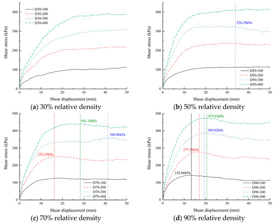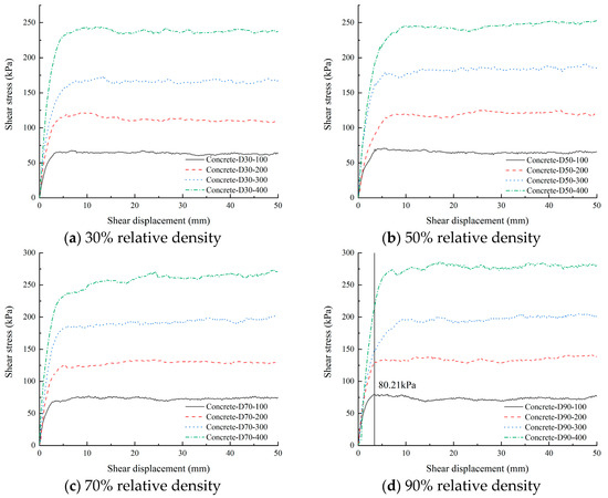 Figure 7. Influence of relative density on shear stress–shear displacement relationship of concrete interface.