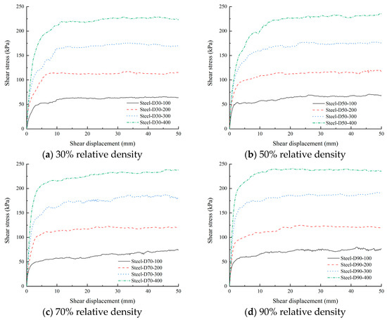 Figure 6. Influence of relative density on shear stress–shear displacement relationship of steel interface.
