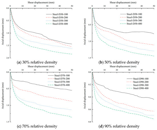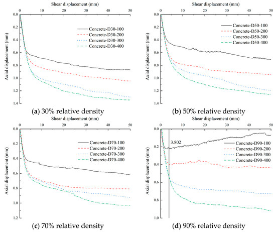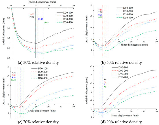 Figure 8 demonstrates the volume change curves of four relative density sandy gravel specimens at different normal pressures. In Figure 8, it can be seen that the sandy gravel specimens all undergo shear shrinkage followed by shear dilatancy in the shear process. As shown in Figure 8a, when the relative density is small, the degree of specimen shear shrinkage is greater than the degree of shear dilatation, and the volume change at the end of the shear shows shear shrinkage. With the increase in relative density, it can be found that the degree of specimen shear shrinkage decreases, while the degree of shear dilatation increases. Furthermore, the shear displacement corresponding to the change from shear shrinkage to shear dilatation in the volume change curve also decreases, and the final axial displacement changes from positive to negative. At the same relative density, the increase in normal pressure prolongs the shear displacement corresponding to the shear shrinkage stage.