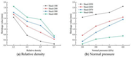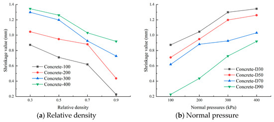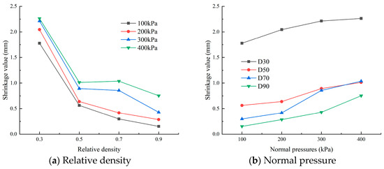 The maximum value of the axial displacement of the volume change curve is taken as the shrinkage value, and the data are summarized as shown in Figure 12. It can be found that the shrinkage value decreases with the increase in relative density and increases with the increase in normal pressure. Figure 12a shows that as normal pressure increases, the slope of the front part of the fold line decreases, while the slope of the back part increases. This indicates that the decrease in the shrinkage value due to the increase in relative density decreases with an increase in normal pressure at low densities, while the decrease in the shrinkage value due to the increase in relative density increases with an increase in normal pressure at high densities.