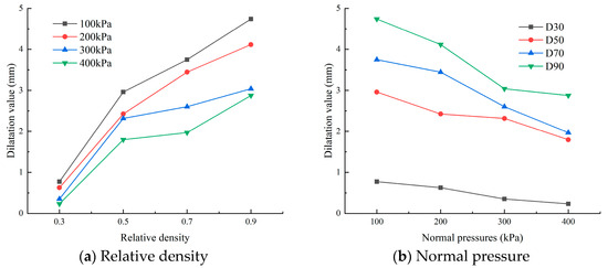The maximum axial displacement of the specimen during shearing is taken as the shrinkage value. The difference in the axial displacement of the specimen from the maximum axial displacement to the end of the shear is taken as the dilatation value. The plotting of shrinkage and dilatation values versus relative density and normal pressure is shown in Figure 9 and Figure 10. In Figure 9, it can be seen that the shrinkage value decreases with an increase in relative density and increases with an increase in normal pressure. The effect of increasing the relative density on the shrinkage value is more significant when the density is small. In Figure 10, it is found that the dilatation value increases with an increase in relative density and decreases with an increase in normal pressure.