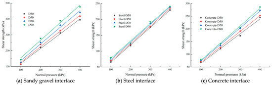The peak shear stress of the shear stress curve within 50 mm shear displacement is taken as the shear strength, and according to the Mohr–Coulomb shear strength formula, the shear strength line is plotted as shown in Figure 15, and the summarized shear strength parameter fitting results are shown in Table 2. For sandy gravel, the angle of internal friction increases linearly with relative density (R2 is 0.998), from 43.0° to 48.0° when the relative density increases from 0.3 to 0.9; the growth trend of cohesion increases with relative density, from 27.2 kPa to 43.6 kPa when the relative density increases from 0.3 to 0.9. For the steel interface, interface adhesion increases linearly with relative density (R2 is 0.992), from 9.8 kPa to 22.0 kPa when the relative density increases from 0.3 to 0.9, while the interface friction angle remains relatively constant around 28.9°. For the concrete interface, both the interface friction angle and interface adhesion increase linearly with relative density, with R2 being 0.985 and 0.973, which is in agreement with the results of Janipour [8]. For example, the interface friction angle increases from 30.2° to 34.2°, and interface adhesion increases from 6.4 kPa to 8.0 kPa, as the relative density increases from 0.3 to 0.9. According to research conducted by Dove and Frost [40], the friction coefficient of the soil–structure interface is influenced by two frictional components: sliding and plowing. In this study, due to the significantly higher hardness of the steel board compared to that of the sandy gravel, changes in relative density do not cause variations in the plowing component during the shear process. However, the hardness difference between the concrete board and the sandy gravel is relatively small, and particle plowing increases with the increase in relative density, leading to an increase in the friction coefficient. In addition, it can also be found that the shear strength, friction angle, and adhesion of the interface shear are much smaller than that of the sandy gravel. For PV pile foundations, this means that surface damage is more likely to occur at the pile–soil interface rather than in the soil when subjected to ultimate loads. Due to the compactness and hardness of the sandy gravel stratum, equipment was required to loosen the stratum prior to installing the PV pile foundations to prevent damage to the piles during installation. Therefore, it was necessary to use the interfacial mechanical properties of the loosened stratum rather than the natural conditions in the design of the PV pile foundations.