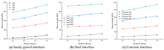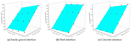 The experimental results for the sandy gravel interface, the steel interface, and the concrete interface were fitted using the above equations, as shown in Figure 17, and the fitted parameters are summarized in Table 3. Through parameter A, it is found that the relative density has little effect on the interface adhesion at the concrete interface and has a greater effect on the sandy gravel and steel interfaces. Through parameter C, it is found that the relative density has the greatest effect on the internal friction angle of sandy gravel, followed by the effect on the interface friction angle of the concrete interface, and almost no effect on the interface friction angle of the steel interface.
