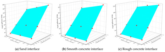 In order to validate the above formula, experimental data were obtained from Figure 3, Figure 4, and Figure 5a in the papers by Janipour et al. [8] and Amini et al. [41], as shown in Table 4. Formula (1) was used to fit the experimental data. The results of this fitting are shown in Figure 18, while the fitted parameters are listed in Table 5. The results show that Formula (1) fits the shear strength and interfacial shear strength well, with the error margin within 4%. This not only validates Formula (1) but also demonstrates that the formula can be applied to sand, in addition to sandy gravel. Further research is needed to determine if this formula is applicable to other types of soils, such as silt.