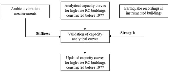 A brief description of the proposed methodology is shown in Figure 1. The proposed methodology makes use of both earthquake motion building response data and data from ambient vibration measurements, which complement the results from nonlinear time-history analyses and update the existing capacity curves that were previously derived in other studies using various analytical approaches. Thus, considering the proposed methodology, both the strength and the stiffness of high-rise residential RC buildings constructed before 1977 can be evaluated and adjusted using real building response data collected during various Vrancea intermediate-depth earthquakes that occurred in Romania.