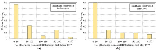 Two histograms showing the number of high-rise residential reinforced concrete buildings built before and after 1977 per county in Romania are shown in Figure 2. An increase in the number of counties in which more than 200 high-rise residential reinforced concrete buildings were constructed can be noticed after 1977.