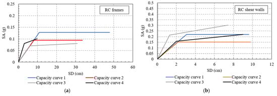 Examples of capacity curves from the above-mentioned literature for the two previously defined classes of structures are shown in Figure 3. It can be observed from Figure 3 that there are significant differences in terms of ultimate displacement for the capacity curves applicable to reinforced concrete frames. The differences in terms of ultimate displacement for the reinforced concrete shear wall structures are significantly smaller. The differences in terms of ultimate spectral acceleration can vary from simple to double within the same sample of capacity curves.