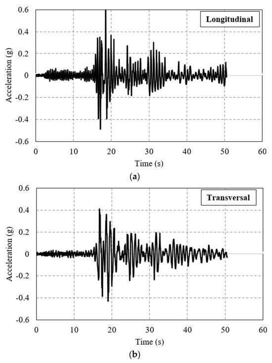 The largest horizontal peak ground accelerations from the recordings obtained in instrumented buildings were observed for a building located in Ploiesti during the Vrancea 1986 earthquake. The location of the building was in the vicinity of the earthquake epicenter. The maximum peak ground accelerations recorded at the top story were 0.60 g in one direction and 0.43 g in the other direction, respectively. The damage sustained by this structure during the above-mentioned event (cracks mainly in the non-structural elements, as well as in the coupling beams) is described in detail by Nestor []. In the same previously mentioned reference, the strengthening works applied to the same structure are also described. The time histories of accelerations at the top of the above-mentioned structure in the two horizontal directions are shown in Figure 4, highlighting the large building acceleration values.