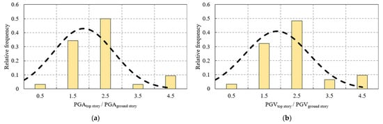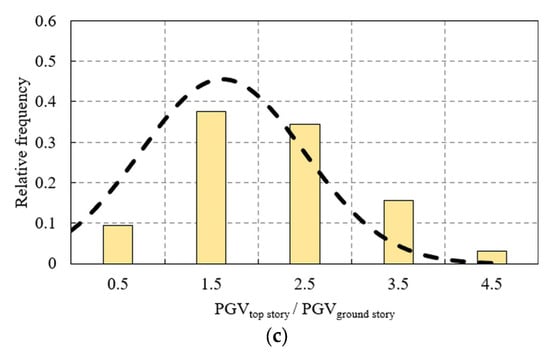 Histograms of relative frequency for the maximum ratios between the peak ground motion values recorded at the top story and at the ground story: (a) PGAtop story/PGAground story; (b) PGVtop story/PGVground story; (c) PGDtop story/PGDground story. The corresponding normal probability density function (PDF) is superimposed with black dashed line on each plot.