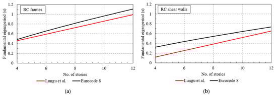 Comparison of the period–height relations for Romanian buildings proposed by Lungu et al. [] and Eurocode 8 []: (a) reinforced concrete frame structures; (b) reinforced concrete shear wall structures.