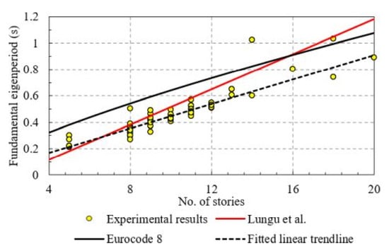A database consisting of undamaged fundamental eigenperiods for shear wall structures was compiled from different studies in the Romanian literature (e.g., [,,,,,]). The total number of experimental eigenperiods is about 100. The experimental values are compared in Figure 8 with the empirical models proposed by Lungu et al. [] and Eurocode 8 [].