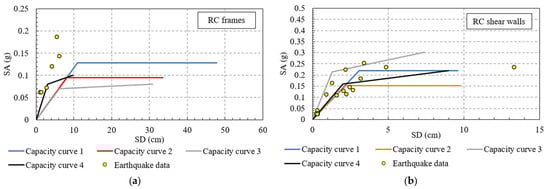 Finally, two updated capacity curves for residential reinforced concrete structures constructed before 1977 with frame and shear wall structures are proposed by combining the previously mentioned analytical curves from the literature with the earthquake data. The proposed curves are shown in Figure 10. The curves from Figure 10 were obtained by adjusting the analytical capacity curves shown previously with the recorded data (using the least square regression technique). The same shape for the capacity curve of infilled frames has been proposed by Martins and Silva [].
