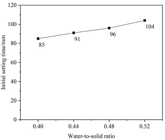 The influence of the water-to-solid ratio on the initial setting time of the binder is shown in Figure 2. It was noted that the initial setting time increased linearly as the water-to-solid ratio increased. At a ratio of 0.52, the initial setting time was 104 min, 22.4% longer than that of the group with a ratio of 0.4. The prolongation in the setting time of the binder was related to the reduction in pH values due to the increased water-to-binder ratio, which not only reduced the dissolution of precursors but also lowered the concentration of ions including Ca2+, [SiO4]4−, and [AlO4]4−, and thereafter to mitigating the reaction between the precursors and alkali solution [36]. The setting of the paste was thus retarded.