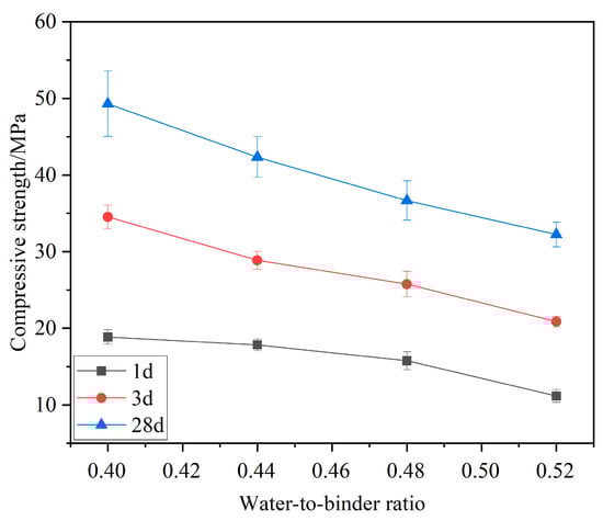 In this section, the influence of the water-to-solid ratio, ranging from 0.40 to 0.52, on the compressive strength of the binder was assessed, and the results are listed in Figure 3. It was observed that an increase in the water-to-solid ratio resulted in a corresponding reduction in the compressive strength of the binder at various curing ages. Specifically, an increment of 0.12 in the water-to-solid ratio led to a reduction in the 1-, 3-, and 28-day compressive strength by 39%, 39%, and 35%, respectively. This decrease in compressive strength was attributed to the appearance of a high amount of pores during the setting and the hardening of the paste; the increased amount of pore formation is due to the generation of more capillary pores resulting from water evaporation at higher water-to-binder ratios [5,37]. Additionally, a slight decrease in the 1-day strength was observed when the water-to-solid ratio increased from 0.40 to 0.44, with the value decreasing by 3.8%, from 18.5 MPa to 17.8 MPa. The decrease became substantial when the curing age increased, attributed to the improvement in the reaction degree at a lower w/s ratio, making the structure more compacted.