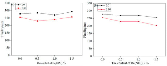 The change in the fluidity of the binder with the addition of Na2HPO4 and Ba(NO3)2 is shown in Figure 4. Notably, the maximum value of the initial fluidity was 292 mm when the Na2HPO4 content was 1.5 wt.%, showing a 5% increase compared to the reference sample (Figure 4a). This improvement in fluidity was attributed to the fact that Na2HPO4 increased the absolute value of the electrodynamic potential on the particle surfaces, thereby enhancing the electrostatic repulsion between particles and resulting in a slight increase in fluidity.