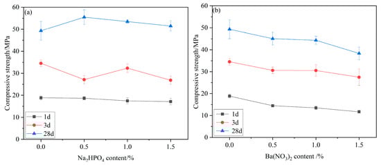 The compressive strength of the alkali-activated FA-GGBFS-TS binder with different retarders: (a) Na2HPO4 and (b) Ba(NO3)2.