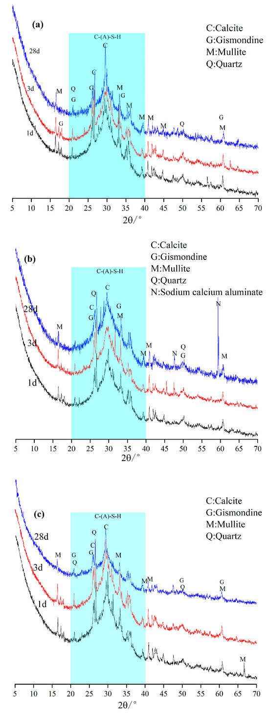 XRD patterns of the alkali-activated FA-GGBFS-TS binder with/without retarders cured for different ages: (a) without retarder; (b) 1% Na2HPO4; (c) 1% Ba(NO3)2.