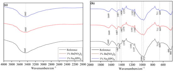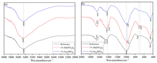 As the curing age increased, the bands between 800 and 1300 cm−1 changed from a bimodal to a unimodal distribution, and structural changes in the system with the addition of retarders were also observed. For instance, the Si-O band was positioned at 955 cm−1 at 3 days, shifting to a higher wavenumber with the value of 966 cm−1 and 977 cm−1 when Na2HPO4 and Ba(NO3)2 were added, respectively. This change indicated an increase in the degree of polymerization, where a reduction in the reaction rate would improve the connectivity of silicate chains, and the structure would be more stable. A different tendency was observed at 28 days, where the stretching vibrations of the Si-O tetrahedron were 994, 984, and 977 cm−1 for the reference samples and samples containing 1% Na2HPO4 and 1% Ba(NO3)2, respectively, shifting to a lower wavenumber. This demonstrates the retarding effect of the substances, where the presence of Ba(NO3)2 would hinder the reaction of precursors.
